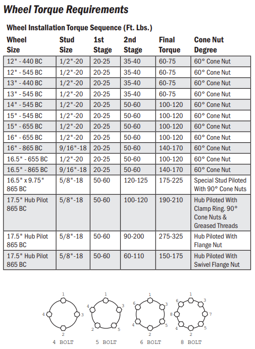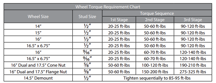 The diameter and thread pitch of wheel studs directly impact how much torque they can safely handle. For example, a 1/2" stud will have a different torque range than a 9/16" or 5/8" stud. Applying the wrong torque to the wrong stud size can result in failure or unsafe conditions. We’ve included a torque chart by stud size for reference, but remember — always follow your manufacturer’s recommendations. Torque values should never be guessed.