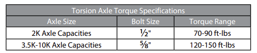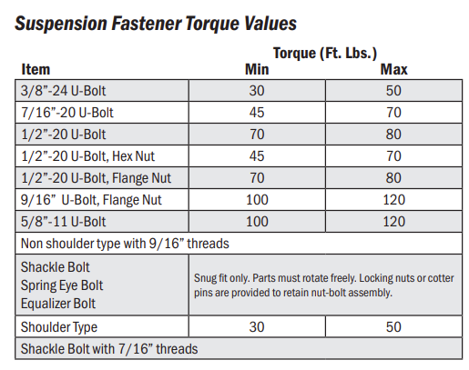 While lug nuts get a lot of attention, don’t overlook your suspension components. U-bolts, shackle bolts, and other suspension fasteners also require proper torque. Under-torqued suspension bolts can lead to axle misalignment, uneven tire wear, and compromised handling, while over-torquing can crush bushings or bend components. We’ve included a helpful chart from Dexter that outlines suspension fastener torque values by size and application.